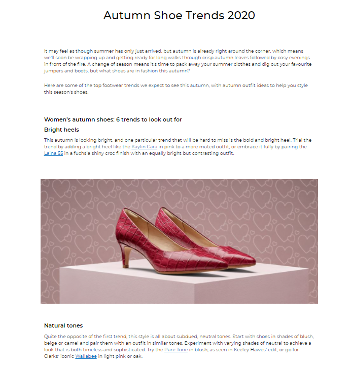 I’ve written more than 50 articles for Clarks’ website. These have mainly been trend-led pieces, how-to guides and listicles. Click the screenshots below to read the full articles.